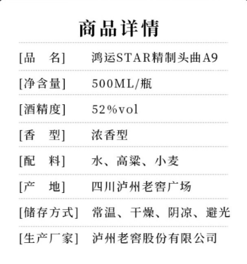 泸州老窖 鸿运STAR精致头曲A9 52%vol 500ml*1 浓香型白酒