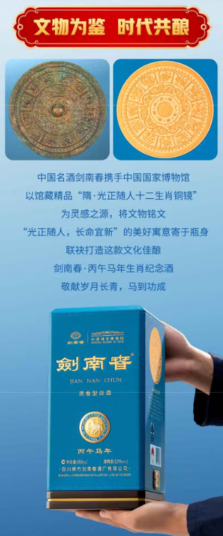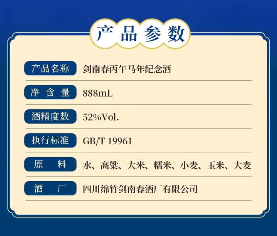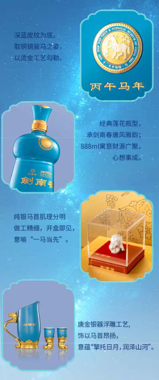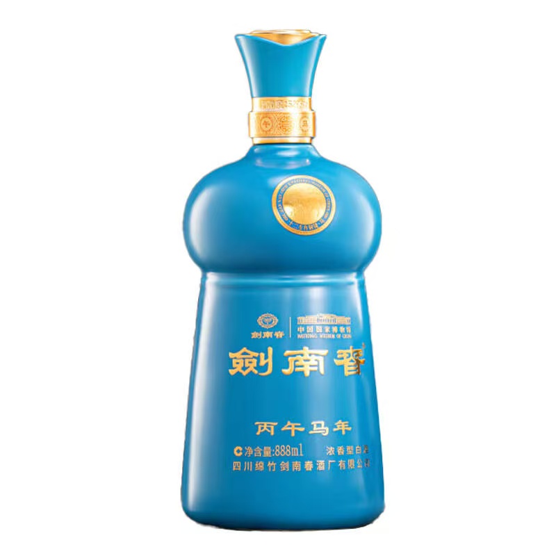 以澄澈霁蓝搭配鎏金质感,瓶身线条圆润饱满,尽显典雅大气。作为剑南春与中国国家博物馆联名打造的生肖纪念酒,它不仅承载着“马到成功”的美好寓意,更以52度浓香型的经典口感、888ml的吉庆容量