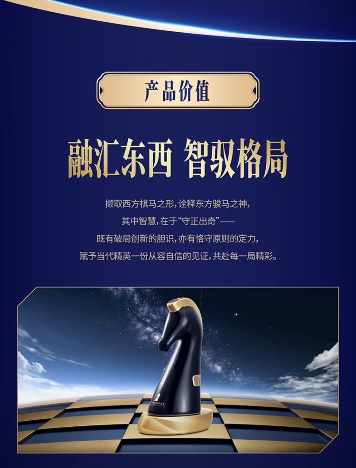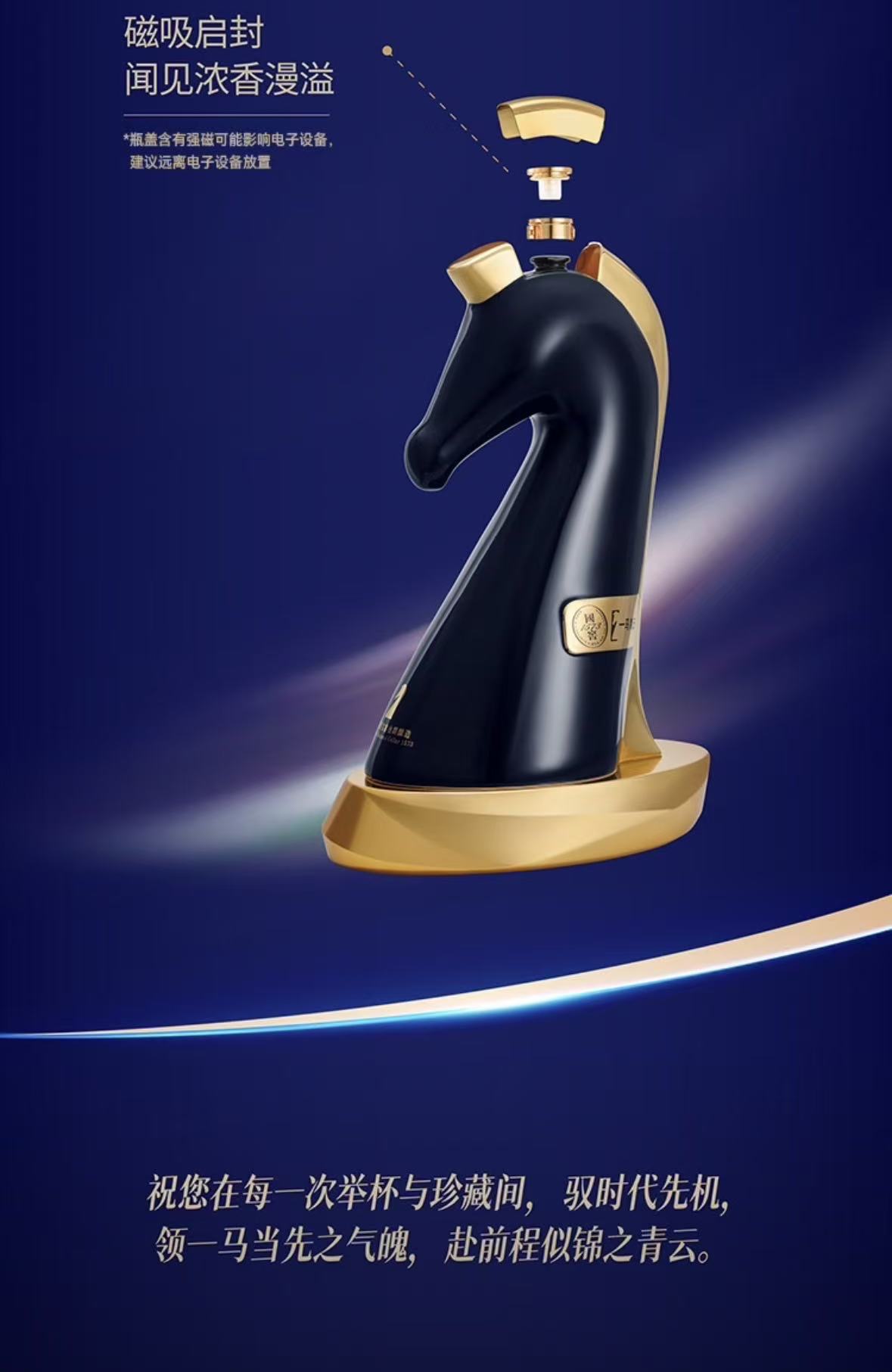 以国际象棋“马”为设计原型,黑金撞色塑造出极具现代感的雕塑瓶身,既是一瓶佳酿,也是一件艺术藏品。 创新磁吸启封设计,轻启即见浓香漫溢,每一次开瓶都是仪式感满满的体验。