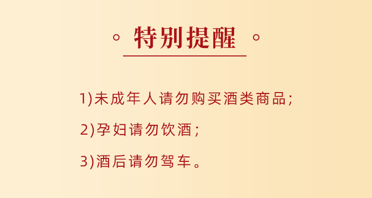 饮酒危害健康,合理饮酒,切勿过量;未成年人请勿购买酒类商品;孕妇、哺乳期妇女请勿饮酒;酒后请勿驾车。